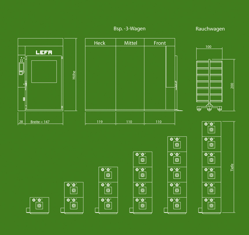 Les équipements à chariots multiples de LEFA sont disponibles sur demande comme équipements en série ou en parallèle. La technologie de fumage correspondante – fumée liquide, fumée par combustion et fumée par pression – peut par ailleurs être sélectionnée et combinée librement. Ici, vous apprendrez plus sur nos équipements à chariots multiples pouvant être agrandis à souhait et pouvant donc s’adapter aux besoins croissants.